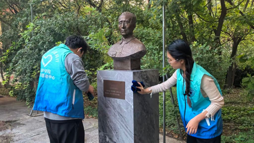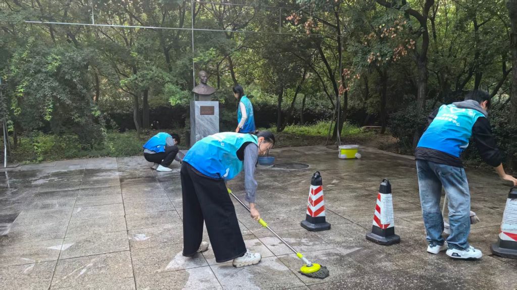 活动当日,阳光洒在静谧的学术广场上,常师贞先生的铜像在晨曦中更显庄重与慈祥。来自公司各年级的志愿者们,精神饱满,早早地在铜像前集合。在活动负责人的简要动员与任务分工后,一场充满热情的清洁行动随即展开。志愿者们分工有序,配合默契,展现出极高的效率与团队协作精神。