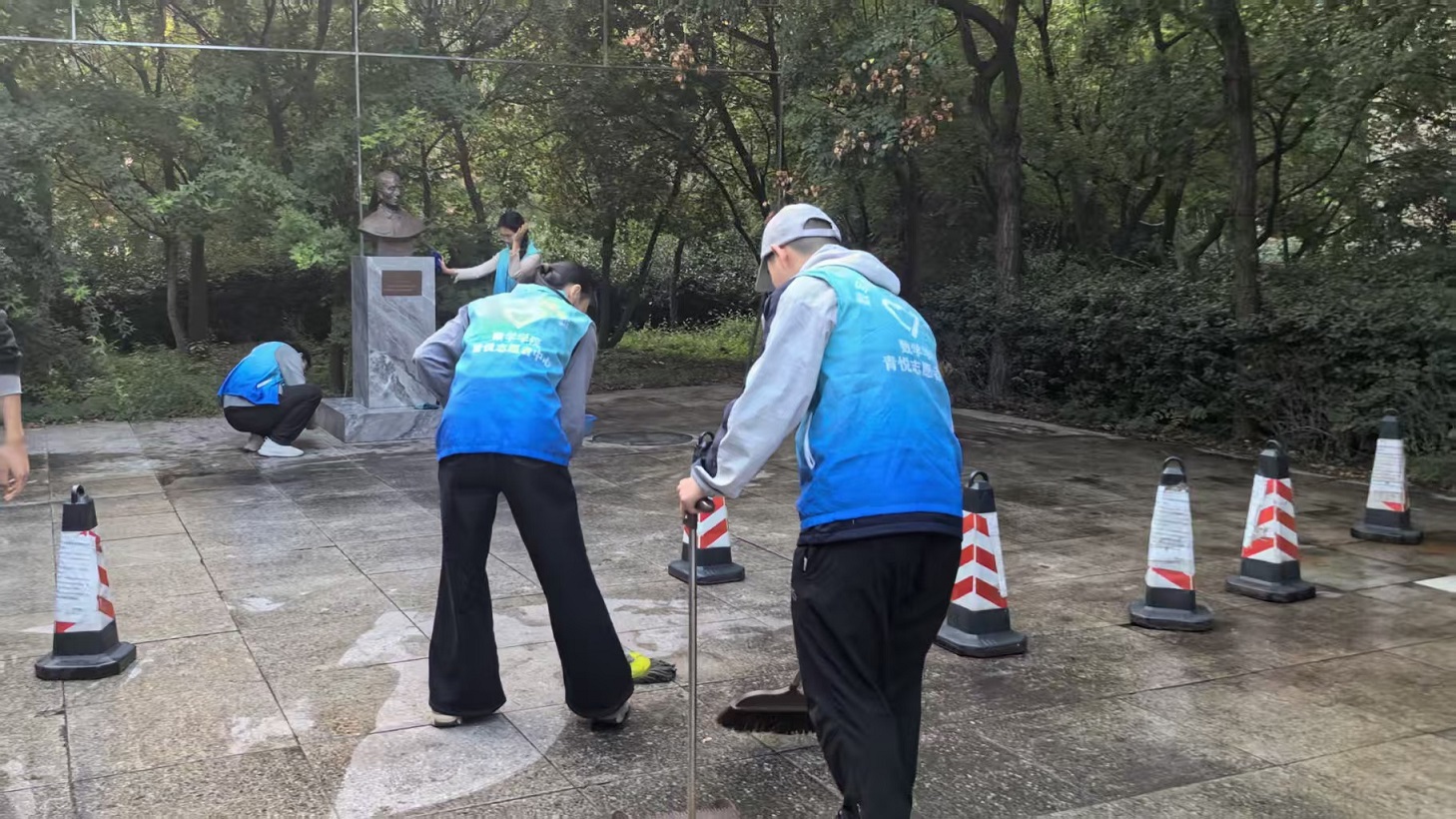 与此同时,另一组志愿者则投入到铜像周边小广场的清洁工作中。他们挥动扫帚,仔细清扫散落在广场地面和绿化带中的杂物;他们细心捡拾,确保每一个角落都恢复整洁。志愿者们全方位清扫与整理,营造出一个一尘不染的优美环境。整个劳动现场忙碌而有序,汗水与笑容交织,构成了一幅动人的校园风景画。