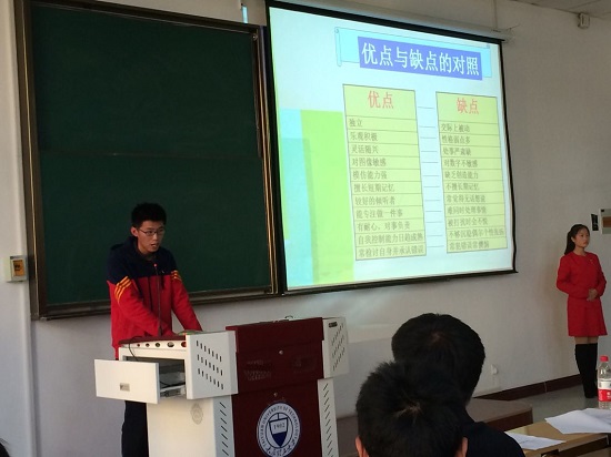 大赛通过“选手自荐”“直面评委”“评委综述”三个环节,考察选手的职业规划、行业分析、专业能力、语言表达等综合素质。从众多选手中脱颖而出的10位参赛选手按序号依次以PPT演讲的形式为大家展示了自己职业生涯规划的思路。他们大多从自我评价、职业分析、短期目标、长期规划等几个方面展开自己的精彩演讲,并且重点分析了自身性格与职业的结合点,从自己所处的环境出发,制定下自己的职业生涯之路。他们自信大方的演讲给了同学们很大的启发,让台下的观众也思考起自己的职业规划。同时,主评审们适时指出了选手作品的亮点和不足之处,并且根据他们的规划给他们提出了中肯的建议。