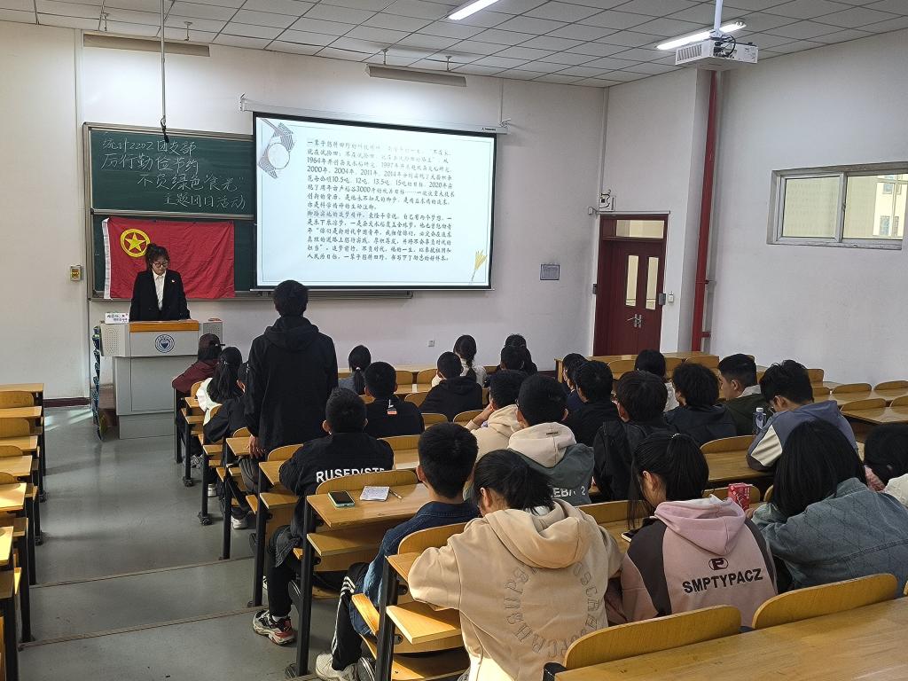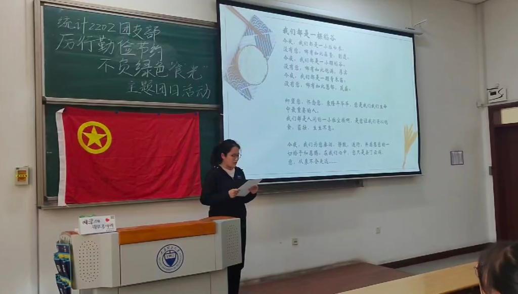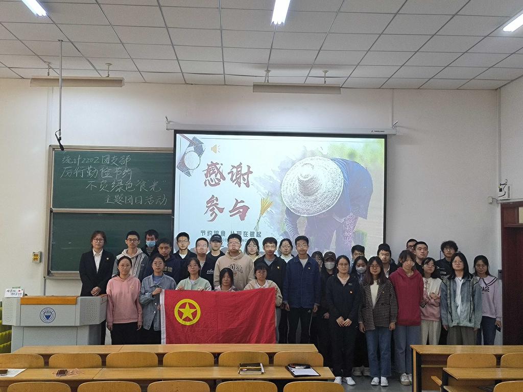 为深入贯彻习近平总书记在党的二十大报告中关于粮食安全的重要讲话,引导支部团员和青年自觉养成勤俭节约、珍惜粮食的绿色低碳生活习惯,统计2202团支部于10月23日在行思楼B220召开“厉行勤俭节约,不负绿色‘食’光”主题团日活动。