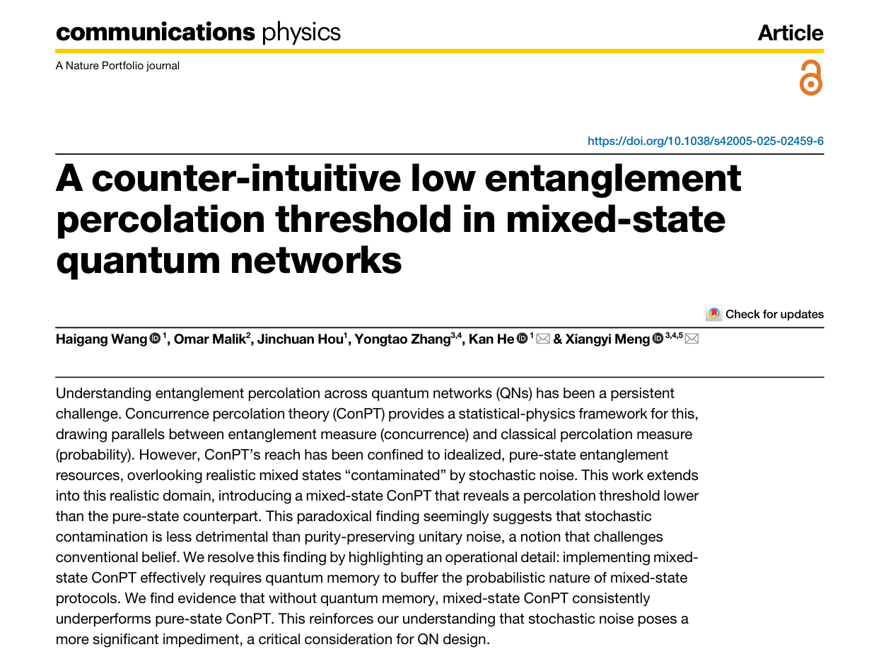 近日,公司yl23411的算子理论与量子信息团队应用算子理论和统计学等数学工具,在量子信息与统计物理领域中的纠缠渗流问题上取得研究进展。该研究工作以题为“A Counter-Intuitive Low Entanglement Percolation Threshold in Mixed-State Quantum Networks”的学术论文发表在期刊《Communications Physics》上。该论文的第一署名单位为yl23411,第一作者是公司博士生王海港,合作者包括侯晋川教授,Omar Malik博士和张勇涛博士,通讯作者为贺衎和美国伦斯勒理工公司孟祥一。