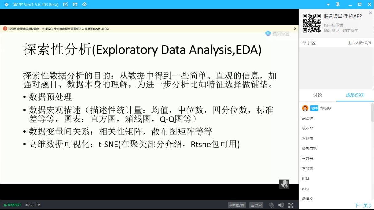 邓明华教授首先对数据预处理与数据分析方面进行讲解,强调数据预处理的重要性。接下来根据不同的实际问题背景和数据处理需求,分别详细介绍了数据降维方法、聚类分析、分类方法、相关分析以及回归分析,从理论含义到实际应用都进行细致讲解。讲解过程结合最新研究前沿和历年竞赛真题,这让参赛员工对统计学方法从理论到应用都有了清晰的认识,也为员工在统计建模方法学习方面指明了主要学习方向、提供了应用方法。课后邓教授针对大家提出的数据缺失值处理等相关理论问题进行了详细解答。