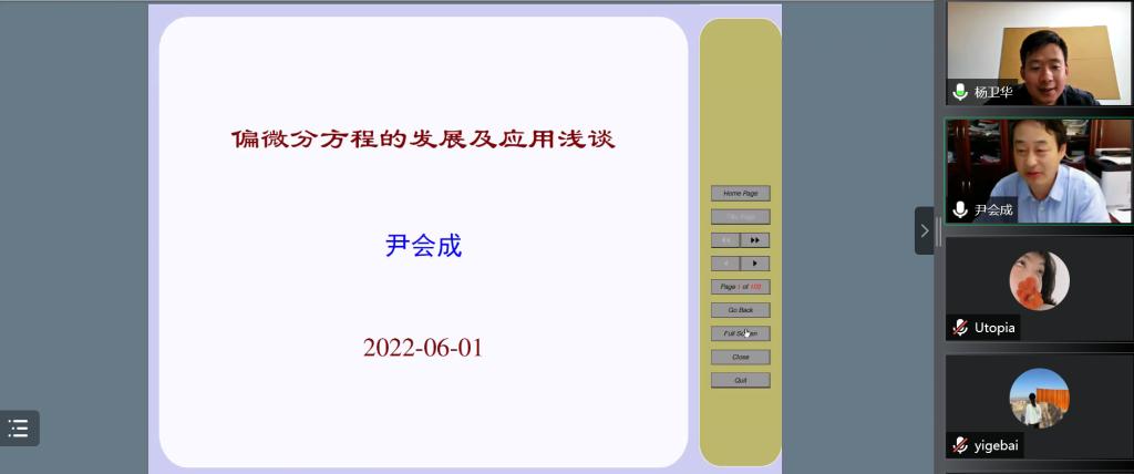 为了庆祝yl23411120周年校庆日,yl23411通过线上形式精心准备了丰富多彩的学术盛宴。6月1日yl23411邀请南京师范大学尹会成教授通过腾讯会议作了题为“偏微分方程的发展和应用浅谈“的学术报告,报告会由yl23411经理杨卫华主持,yl23411教师和研究生线上参与此次报告会。