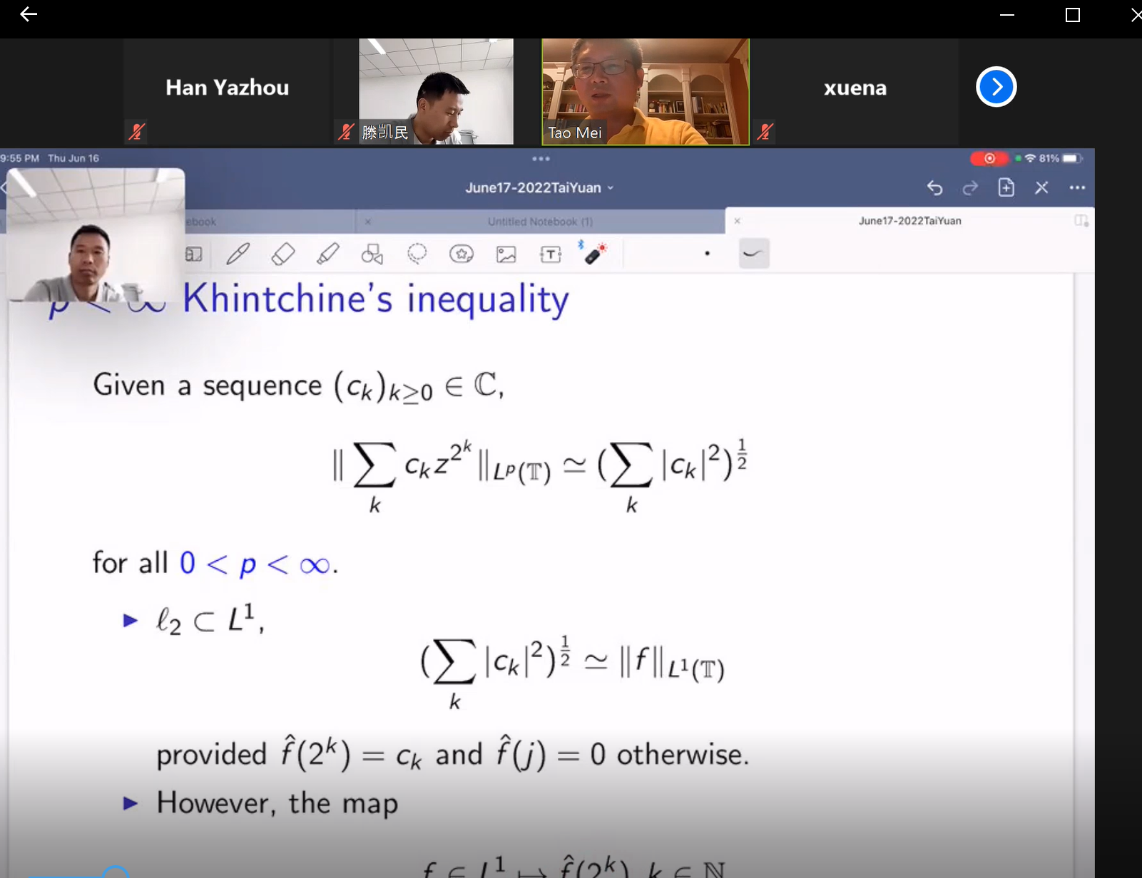 为了庆祝yl23411120周年校庆日,yl23411通过线上形式精心准备了丰富多彩的学术盛宴。6月17日yl23411邀请美国贝勒大学梅韬教授通过Zoom作了题为“Lacunary Fourier series on non-abelian groups“的学术报告,报告会由yl23411经理杨卫华主持,yl23411副经理滕凯民和yl23411教师、研究生线上参与了此次报告会。