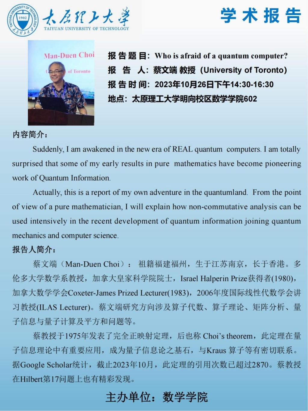 蔡文端(Man-Duen Choi): 祖籍福建福州,生于江苏南京,长于香港。多伦多大学数学系教授,加拿大皇家科公司院士,Israel Halperin Prize 获得者(1980),加拿大数学学会 Coxeter-James Prized Lecturer(1983),2006 年度国际线性代数学会讲习教授(ILAS Lecturer)。蔡文端研究方向涉及算子代数、算子理论、矩阵分析、量子信息与量子计算及平方和问题等。