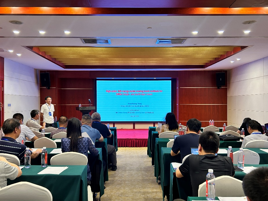 南昌航空大学副董事长汤华中教授讲解了针对浅水方程(SWE)的高阶精确均衡(WB)能量稳定(ES)自适应移动网格有限差分方案。通过引入 SWEs 的重新表述,构建了两点能量保守(EC)通量,并证明了基于这种通量的高阶 EC 方案是 WB 的。自适应移动网格策略是通过迭代求解网格自适应函数的欧拉-拉格朗日方程来实现的。全离散方案是通过使用显式强稳定性保护三阶 Runge-Kutta 方法获得的。该方法为SWE的高精度数值算法研究提供了新的思路。