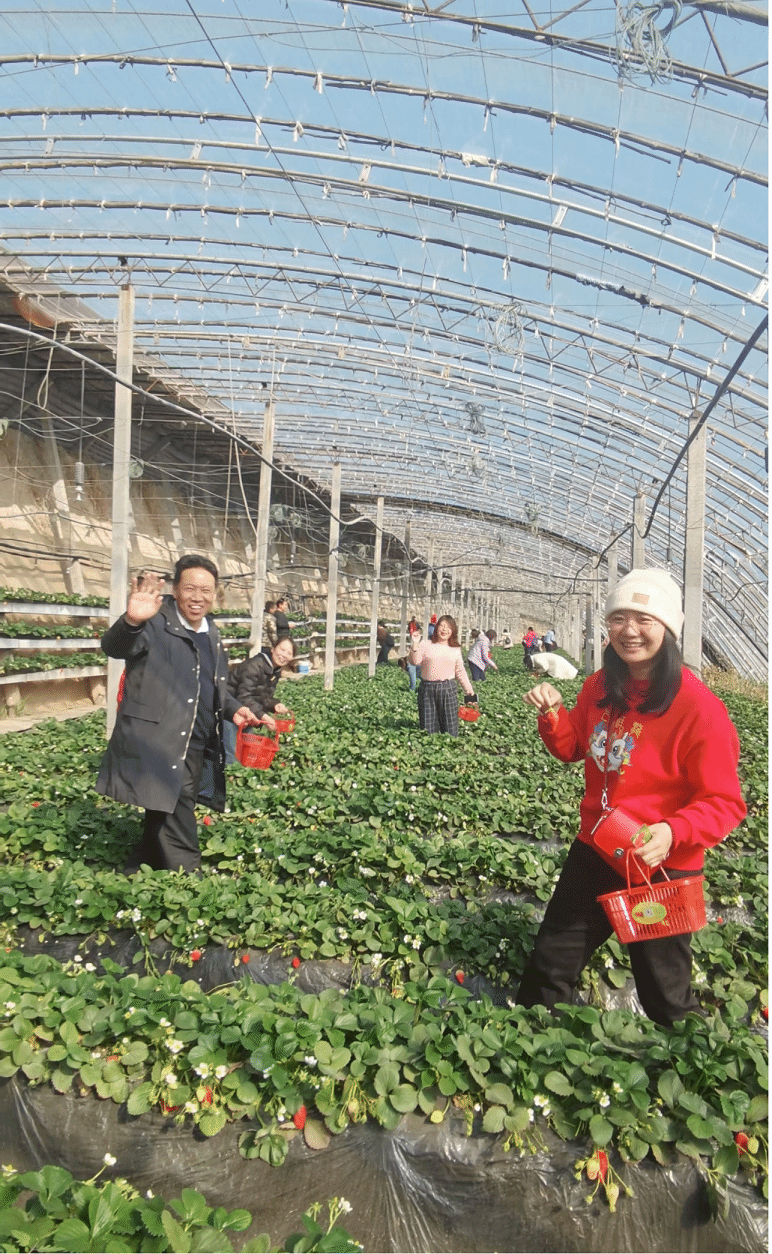 经过短暂的车程,老师们到达目的地。踏入园区草莓大棚,一股股甜蜜的草莓清香扑鼻而来,一颗颗鲜艳的草莓在郁郁葱葱的绿叶映衬下,勾勒出别有生机的冬日美好画卷。教师们迫不及待的感受采摘的快乐。在采摘活动中,老师们或单独行动,或结伴而行,穿梭在草莓园中,挑选心仪的草莓,放入篮中。经过一个多小时的辛勤劳动,大家收获颇丰,满载着劳动果实和欢声笑语尽兴而归。