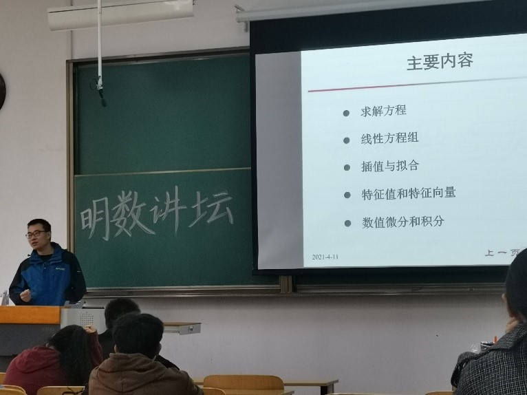 2021年4月11日下午2点,公司科技创新中心、数学建模协会在行知楼B113举办“数值计算相关内容详解”为主题的明数讲坛系列讲座。本活动有幸邀请到公司教师闫玉龙作为主讲人,为同学们讲解数值计算相关内容。