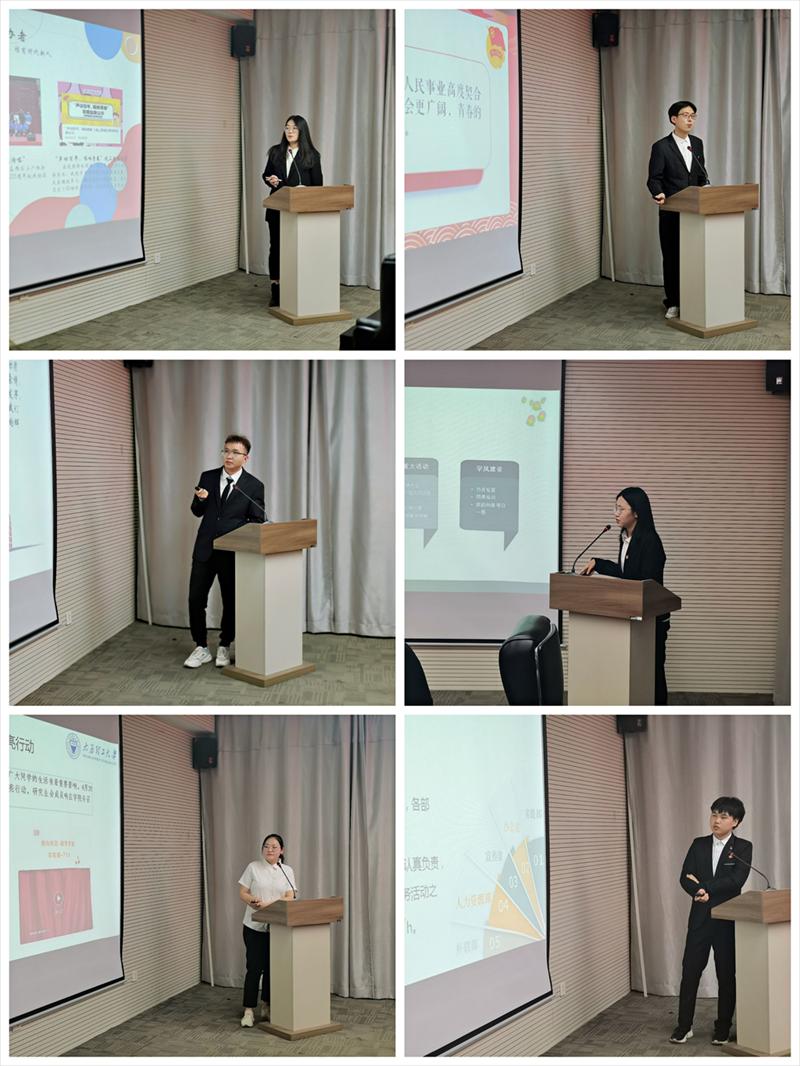 会议初始,李楠楠为大会致辞,李楠楠指出,不做青年官,只做青年友,拒绝做躺平式的员工干部,书记的殷殷嘱托让在场的员工干部醍醐灌顶。接着,李楠楠和冯妍分别为主席团代表和部长代表颁发任职证书。随后由2021-2022年员工组织负责主席进行现场述职。研究生会、员工会、团委、新媒体中心、科技创新中心、青悦志愿者中心的组织负责人依次汇报了一年以来的各项工作任务,围绕组织建设和服务同学,思考总结了这一年的成就以及仍旧存在的问题,并对部门未来的发展提出建议,对即将接任的下一任主席表达期望。