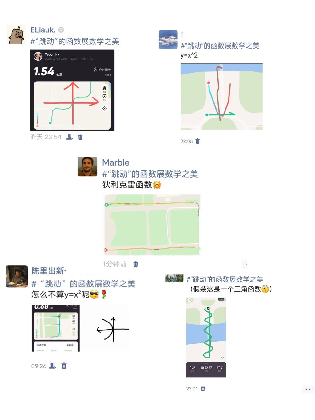 值此春天,万物复苏,在铿锵有力的步伐中迈出新的未来,奔跑起来,跑出函数,跑出生活中的精彩,“‘跳动’的函数”让同学们在酣畅淋漓的运动中感受着数学的美妙,一张张函数图像的跑步打卡彰显着无限活力,吸引着同学们与运动中享受数学的乐趣。