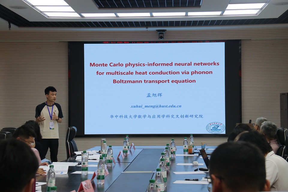 华中科技大学孟旭辉教授则带来了“Monte Carlo物理信息神经网络用于声子Boltzmann输运方程的多尺度热传导模拟”的报告。孟教授是国家级青年人才项目获得者、小米青年学者、华中卓越学者特聘教授,曾在美国布朗大学应用数学系从事多年博士后研究。其提出的MC-PINNs方法有效结合深度学习与蒙特卡洛采样,克服了高维积分问题的困难,在从弹道传热到扩散传热的跨尺度建模中展现出良好的数值稳定性和计算效率。