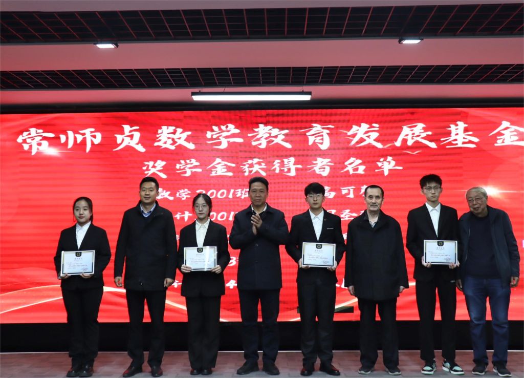 数学2001班高可馨、信计2001班周圣瑛、信计2002班台明浪、信计2003班马超、信计2004班王鹏飞共5位本科毕业生荣获常师贞数学教育发展基金奖学金。李楠楠为获奖员工致颁奖词,游志勇、杨卫华、张洪斌、常励中为获奖员工颁发证书。